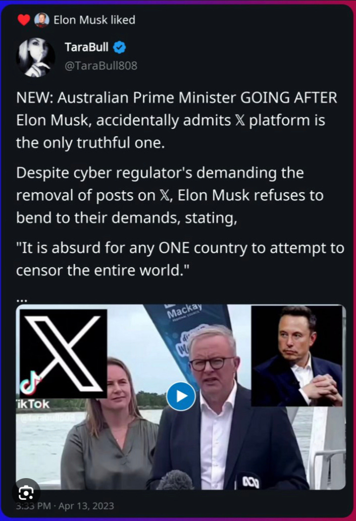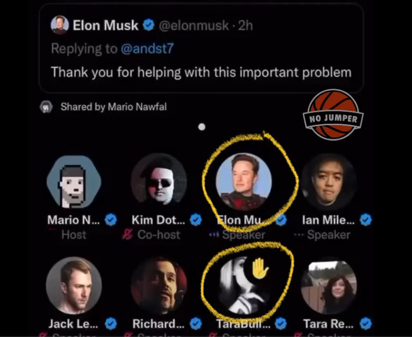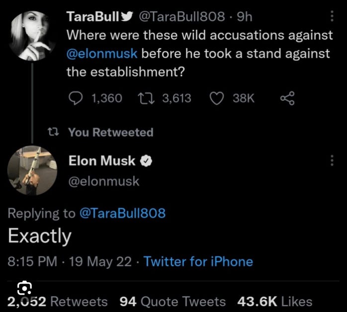 At any rate, who really are these bizarre people? While there are a number of interesting things to be said about “@TaraBull808”, the most unusual is the fact that she’s one of the very select few accounts regularly in contact with Elon Musk himself - a man I’ve been particularly critical of, and who I believe there are reasonable grounds to suspect of criminal behavior at an immense scale.