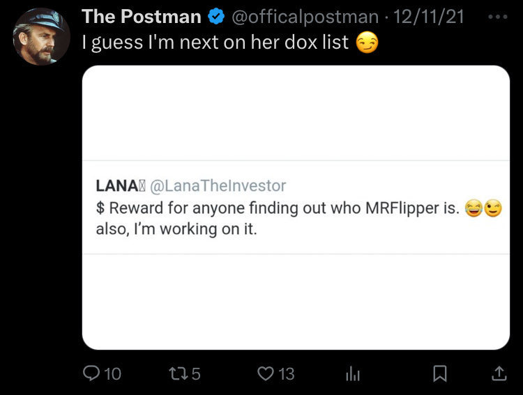 To begin, the user who now calls himself “@officalpostman” appears to be “@Mr_Flipper81”. Among other things, this user looks to be have been unusually involved with fintwit/meme-stock pump speculation and so on, that great contemporary American pastime.